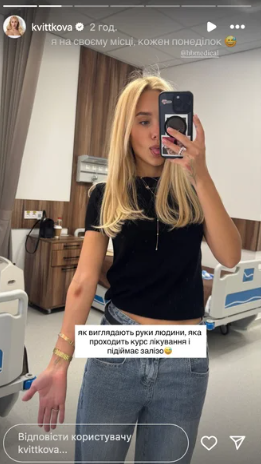 Після процедур на руках з’явилися помітні синці, через що фанати запідозрили травми чи проблеми зі здоров’ям. Квіткова запевнила, що це нормальна реакція на регулярні крапельниці та попросила підписників не хвилюватися. Вона також порадила жінкам періодично перевіряти важливі показники крові.