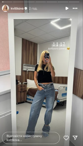 Даша Квіткова оприлюднила фото в Instagram-stories. На знімках вона стоїть у лікарняній палаті в синіх джинсах, чорній футболці та бахілах. Блогерка пояснила, що проходить курс лікування через низький рівень заліза в організмі.